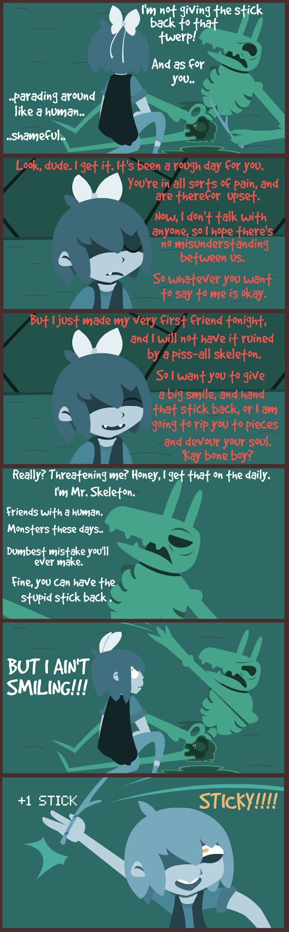 I hope Sticky doesn't hold this against him...for long. Meanwhile Slime is getting a LEEETLE too familiar with Skeleton..hope it doesn't get embarrassing for either / both of them. :D