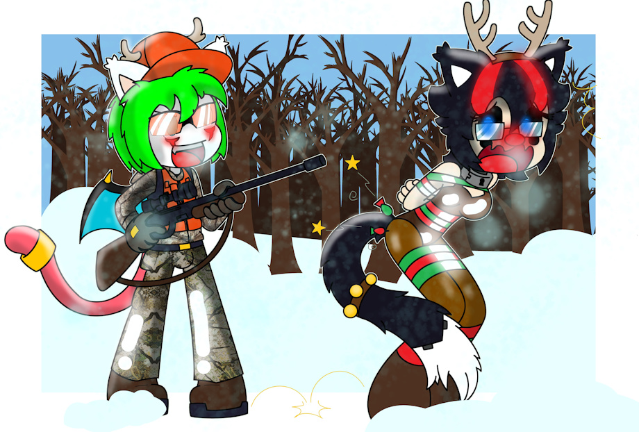 aliya slowly wakes to see herself tied up in the middle of the snowy forest all tied up, she was abit scared at first hopping around the forest wondering where she was then a sudden jolt of pain in her rear end. aliya: "OWW! what the-" ???: *from the distance* BULLSEYE!! aliya suddenly looked behind her to see zaki with a dart rifle and hunting gear aliya: "wha... ZAKI WTH?!" zaki :"haha this is the surprise kitty, ITS HUNTING SEASON" zaki then fired another shot but missed catching aliya by surprise having her hop away from her attack with zaki following behind thus beginning the reindeer season ____________________________________________________________________________________________________________________________________ a small little gift for