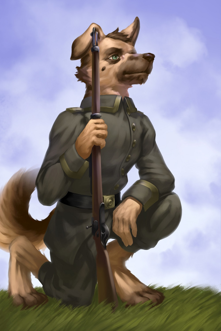 About this commission - some of you might recognize that it's similar to my WW1 German Shepherd that was among the first pieces I ever posted here. I actually got the chance to revisit my old piece with this commission! I am extremely grateful for being commissioned for this and can say I thoroughly enjoyed working on it! My style has become a bit more colorful and cartoony in the meantime, but I kinda like it that way!