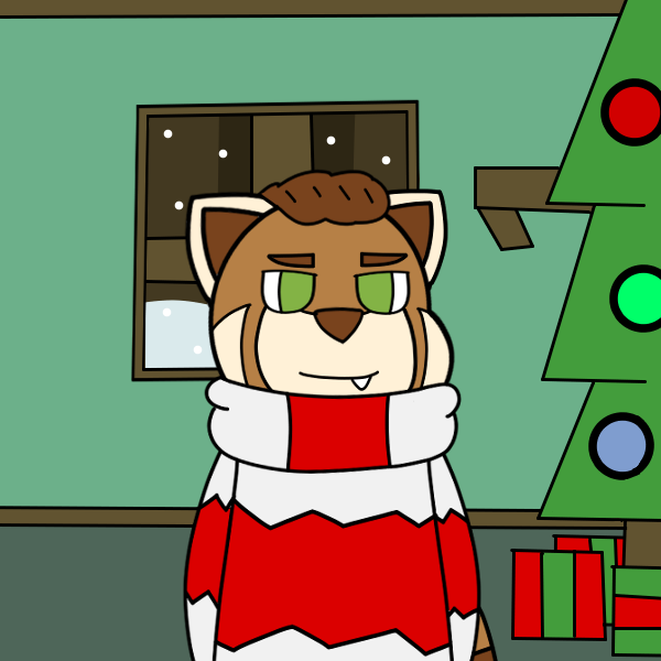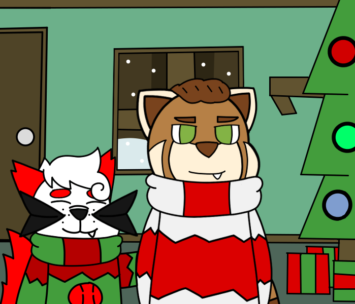 Something I commissioned @OliverOshawott , my character, Kittzy and his, Oliver, standing by the Christmas tree in our holiday sweaters.
