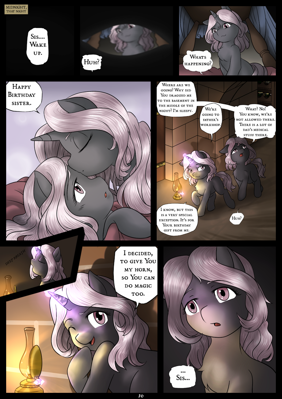 I love tragic stories in which someone wants to correct something and means it good, but even how good a person is, or good intentions did the person had, the end result will turn out tragic... (Tragedy & Love & Vampire book recommendation: I, Sthrad. It's the vampire love story Twilight wish it could be! Read it, you won't be disappointed!) ...And I have that kind of vibes from this comic. Uni-sister may try to find a way to fix a horn onto e-pony sister. I can imagine a ton of things such a bad idea can go wrong. Top scenarios include fusing a dead unicorn's horn onto the earth-pony's head, which would explain Mingle's dead-ish looking gray eye as a side effect...but there is an even more obvious scenario available... ...you didn't had this conversation about kidney transplant and blood relation compatibility for nothing. It's all screaming "Chekhov's gun" to me...She will try to pass on her own horn, and will succeed in it...OR fusion with the sister, which would explain Mingle's different eye colors...