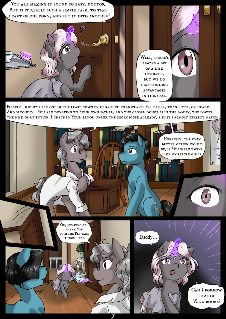 I love tragic stories in which someone wants to correct something and means it good, but even how good a person is, or good intentions did the person had, the end result will turn out tragic... (Tragedy & Love & Vampire book recommendation: I, Sthrad. It's the vampire love story Twilight wish it could be! Read it, you won't be disappointed!) ...And I have that kind of vibes from this comic. Uni-sister may try to find a way to fix a horn onto e-pony sister. I can imagine a ton of things such a bad idea can go wrong. Top scenarios include fusing a dead unicorn's horn onto the earth-pony's head, which would explain Mingle's dead-ish looking gray eye as a side effect...but there is an even more obvious scenario available... ...you didn't had this conversation about kidney transplant and blood relation compatibility for nothing. It's all screaming "Chekhov's gun" to me...She will try to pass on her own horn, and will succeed in it...OR fusion with the sister, which would explain Mingle's different eye colors...