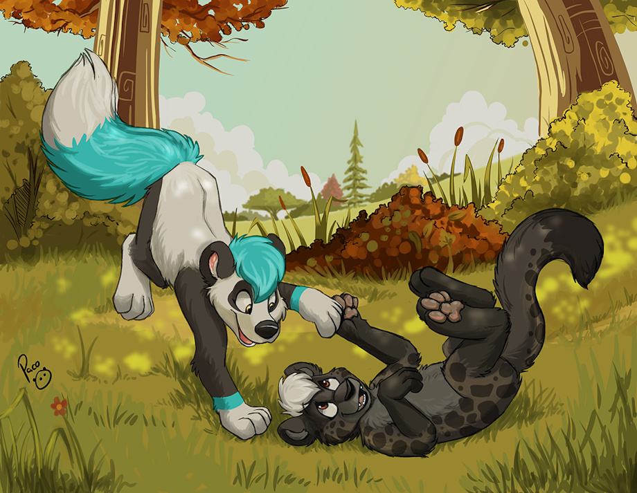 The cute feral characters on this scene are Lunnary the folf and Rhona the black snep, playing together.