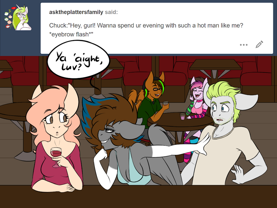 The pinkish ponies ref said "Girl with dick" which I thought meant they was kathoey but they were actaully a pre op trans woman, so they didn't have tits, this is the problem with drawing peoples pony OCs as anthro -.- Anyway, the gag was PK can pick up on people that got a little extra, it's her perv senses