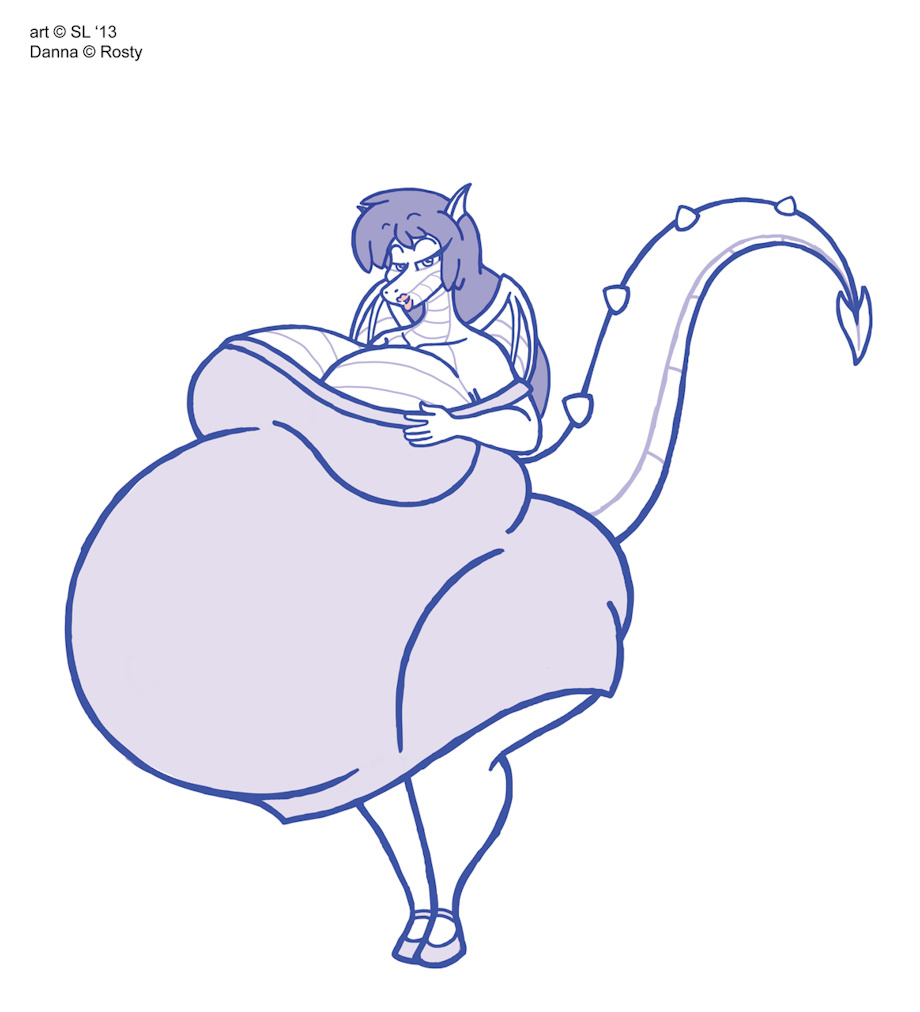Danna the heavily-laden dragoness shows off her figure in a rather short looking dress. She seems to be rather proud of how well it accentuates her rounded shape; so maybe that's why she's beckoning to you with that "come hither" look in her eye. =p