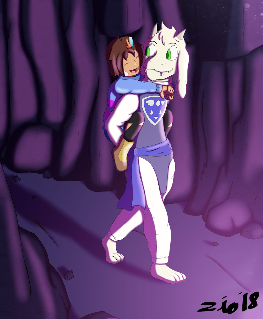The human, having fallen a far distance, hurts her leg in the fall. As such, a helpful monster is giving her a ride. More practice in cave environment and lighting.