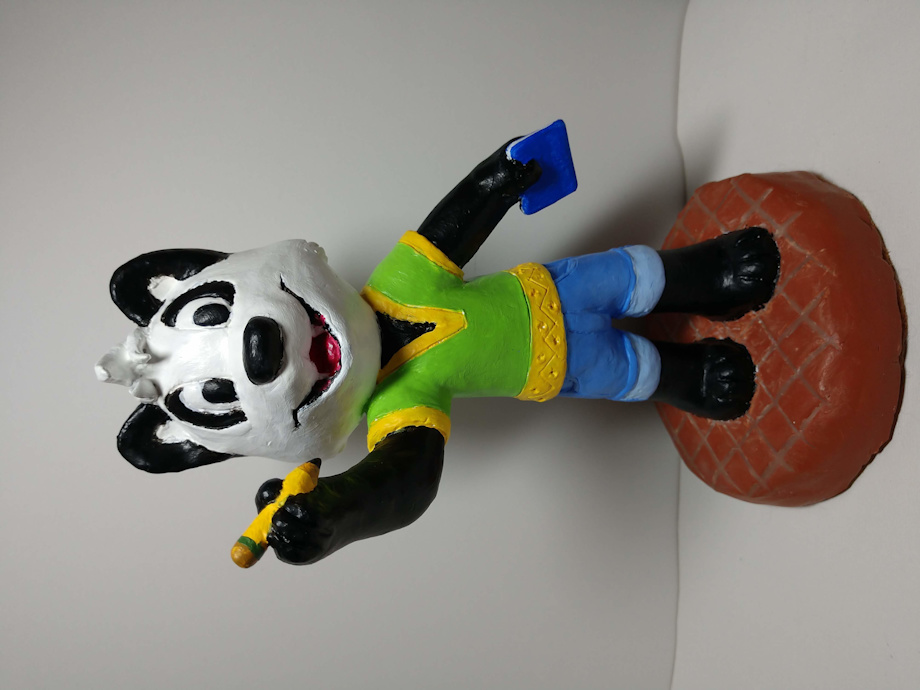 It’s hand sculpted out of polymer clay. White Sculpey inside, Super Sculpey on the surface. Painted with acrylics over acrylic gesso. The tiles on the base are unpainted terracotta Sculpey with Super Sculpey grout. I originally intended to dash this off fairly quickly. I just kept going with adding details beyond the original naked panda and it took longer than intended but I really like the way it came out. If the pants were longer I’d have added cargo pockets but the rolled-up legs came out pretty nice. I only made one other toony type figurine before, a bunny I made for my mother’s birthday two years ago. This one came out so much better but I'm still learning and see things I could've done differently. I'm thinking of getting an airbrush, for one thing, to get that nice smooth look with the paint. Updated with some better photos.