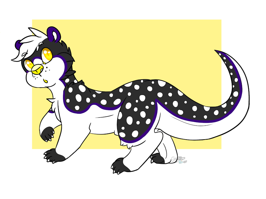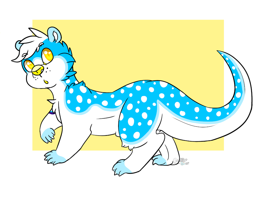 Lemon is an all white otter with yellow nose/paw pads/tounge/eyes/fleash.
