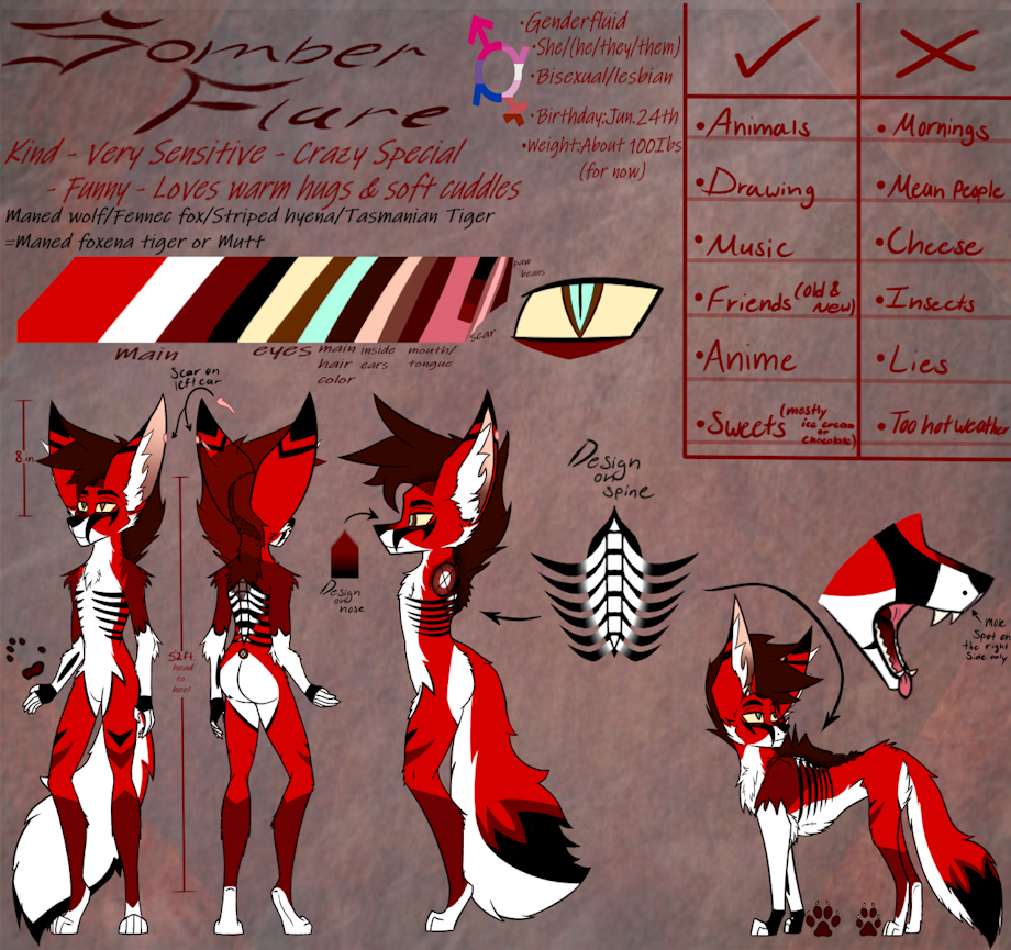 It's finally complete!! I finally have an official ref sheet of my fursona!! I can now join in on all the meme's and trends. Please welcome the new and improved Somber Flare!! Side note: Gonna make a few other ref sheets of my clothes, hair styles, and etc.