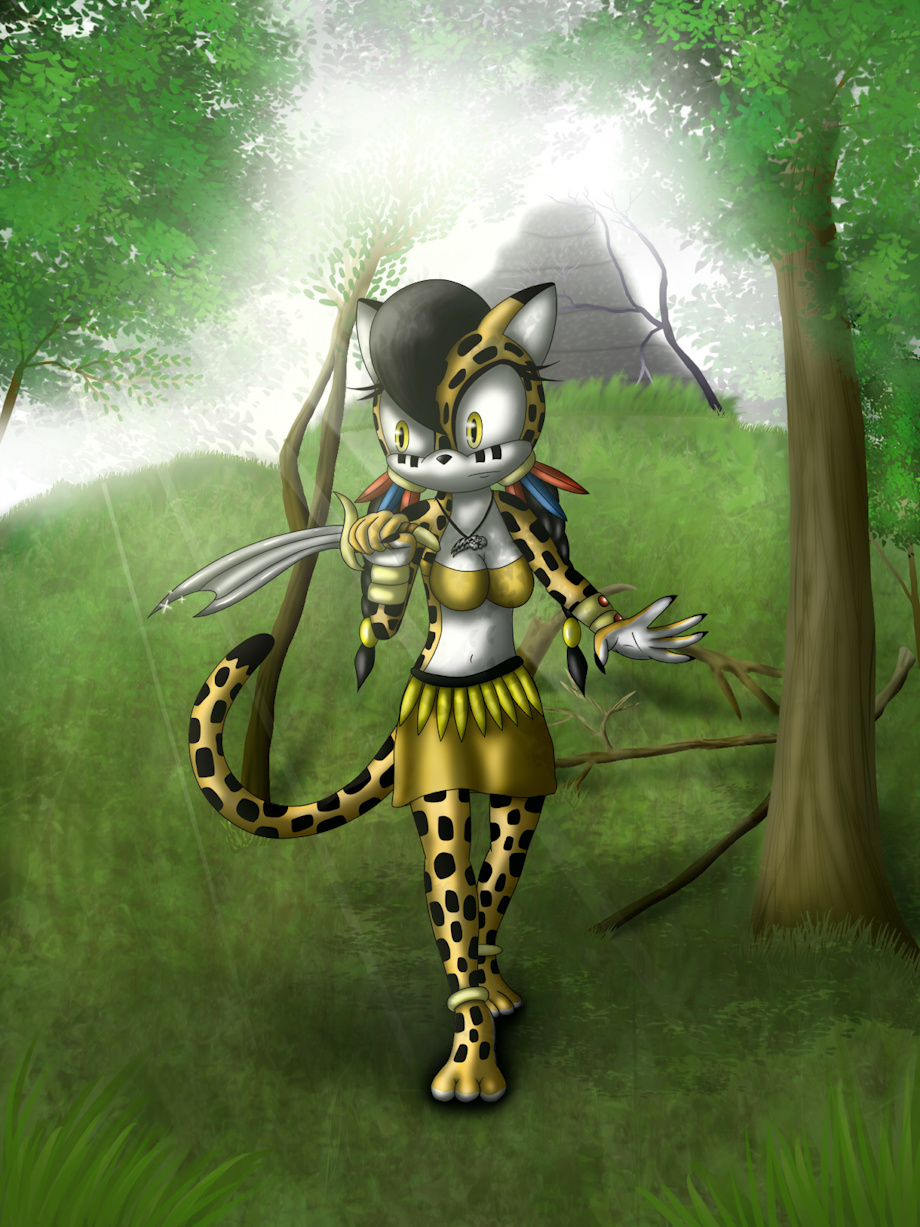 Shanay lives alone in the jungle since over 10 years, because of the banishment out of her hometown. She had to survive in the jungle all alone and was very scared when she was a little child. But within the years she learned a lot about how to deal with it. She learned how to do self defense and how climb and to camouflage. Within the age of 12 she found something shiny in the thick forest. It was a curvy knife. Since that time she used it as her weapon.