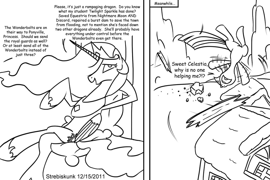 An alternate take on the events from "Secret of My Excess." With a rampaging dragon destroying the entire town, the Princess sent... three Wonderbolts?... to the rescue! Huh?