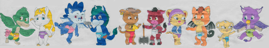 The reason why some of them are drawn as if on top is cause some I drew together on one sheet. but mostly the drawings of the Mythie involved with my characters are drawn together as well.