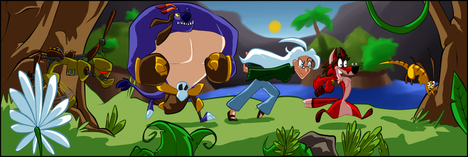 Sketched by my mate. These are his characters in pursuit of a fuzzy yellow creature. I outlined and colored it.