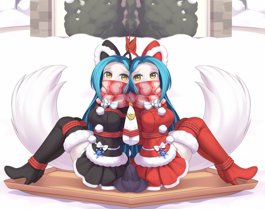 “Hey Ashleen! Hey Pepper! Hello-ooo~!” A young jackal woman eagerly ran up to the cuddly couple. “I didn’t know you were out too!” “Heehee! Hello, Kebbi!” Ashleen happily let herself get glomped by the Egyptian beauty, but Kebechet had some sneaky plans of her own. While she had the cyan-haired snuggled up against her fluffy winter jacket, she swiftly pushed the kitten’s arms behind her back and tied them together with a length of soft red rope. “Nyeep! Keb, what are you doing!?” Hearing Ashleen’s distressed mewls, Pepper decided to intervene. “Allright, Keb, can I have my girlfriend b- ack!!” But get enthusiastically hug-tackled to the floor instead. “And of course I haven’t forgotten you, Peppi!” Producing more ropes from seemingly out of nowhere, the jackal had her red-panda friend arms and legs bound before she knew it. “There all, nice and snug!” “Grr… what are you playing at, ‘chet?” Pepper grumbled as the black-furred canine but her down on the sleigh she and Ashleen had been playing with. “You could’ve just asked to come over if that’s what you wanted!”
