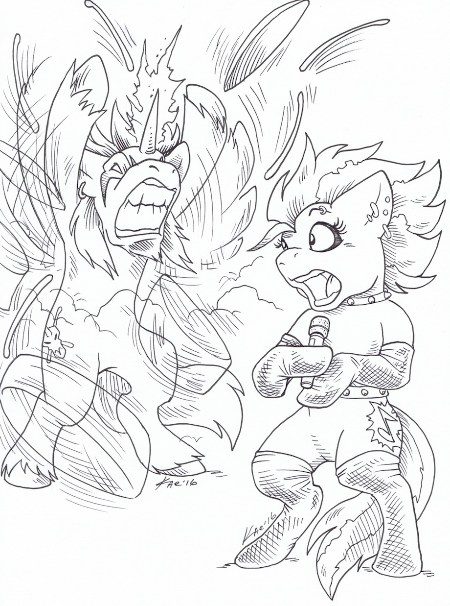 Two more of their members, Melody Canter, Van Canter's younger sister is the group soprano and synth-vocalist. Then there's their drummer Snizz, though that's his stage name that he got from a Freudian slip by a stagehoof. His real name is Downbeat. Yes, they're an acapella group with a drummer. Snizz is one of the best rock drummers in Equestria, though he's also one of the wildest too. The easier he finds a tune the more showboating and stick tricks he does and he can get WILD at times.