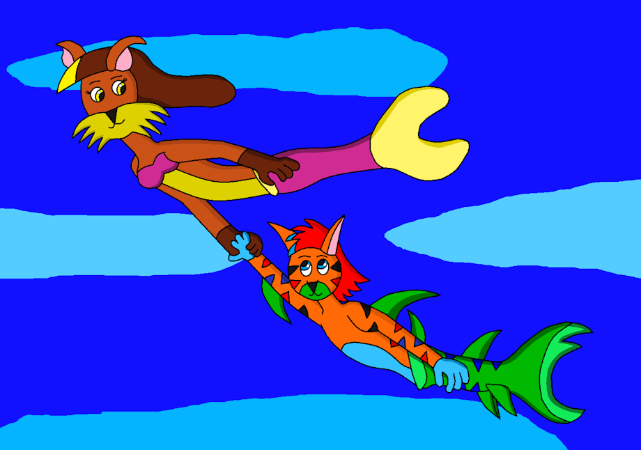 I haven't many ideas latey and as I haven't done much withthese too I thoungt I do something diffeten. By turning them into sea creatures. AS you see Jazz is a noumel mermaid while Kite is shark's like. I also did diffeten colours to their fur (Like the halloween one I did with them). SO you could say being turning sea creatures chagen their fur. And also it's my art so I wanted to do added some unusual color to it.