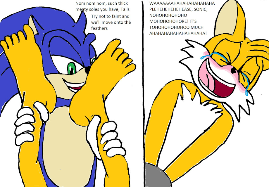 Been too long since I did a male on male tickle pic and no other duo deserves one than Sonic and Tails. Turns out Sonic is quite a sadist and Tails' cute ticklish feet are too irresistible. Maybe Tails will get the chance for revenge if he doesn't pass out from laughter