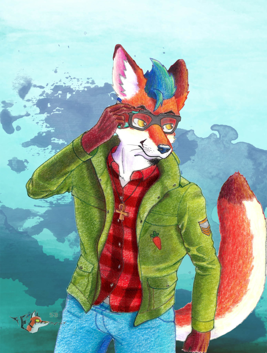 The name is Kenneth Reinhard Sommerfield, one of my first sonas; your tipical chill fox, exept he is as sly as a brick and has the speech abilities of Google traductor, also he doesn't has a prescription for the glasses, those are just looks