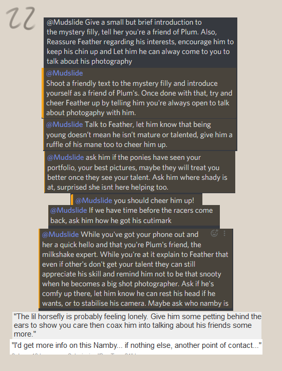 You look at the username of this unknown filly Plum is trying to hook you up with....that might as well be the easiest way to introduce yourself. You tap away at your phone as Feather talks.