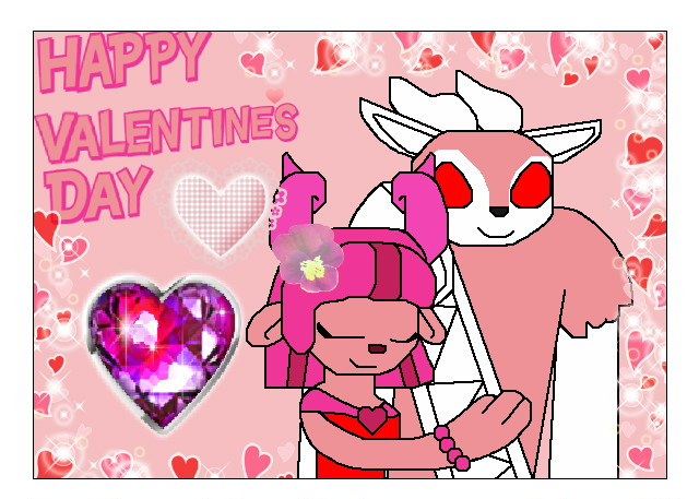 A Valentine themed picture with Splat, wearing a lovely dress, and Buckshot, who is Heartbreaker Buckshot.