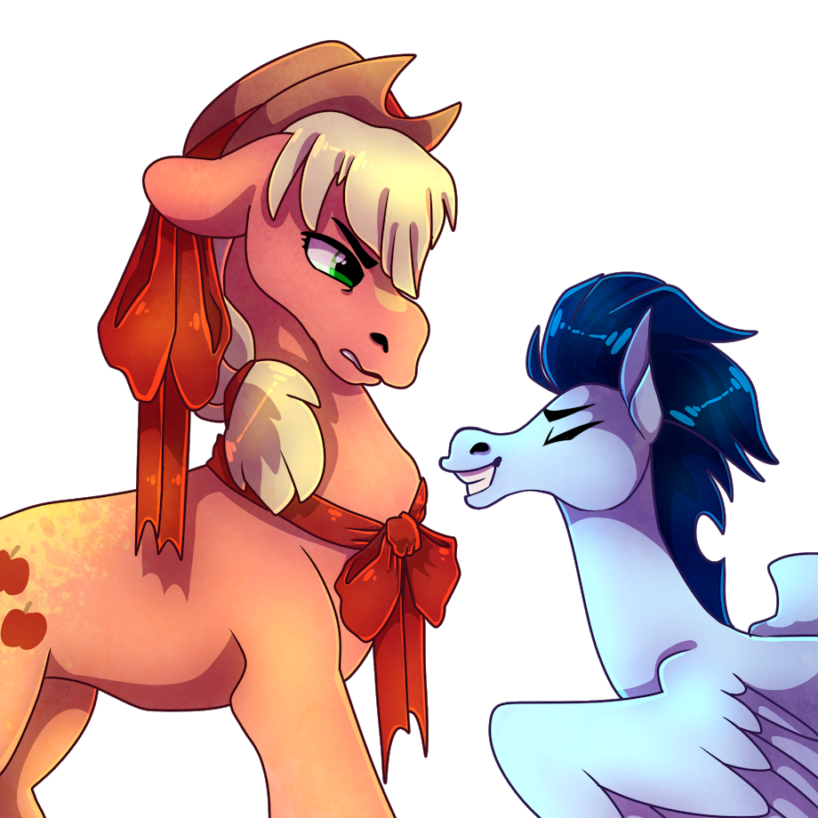 My personal ship , Apple Jack and Soarin . A conflicting duo , AJ always a bit confused and put off buy the excitable advances of the feathered young lover who would follow her everywhere .