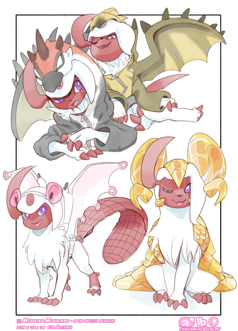 An unusual one here! The prompt was that these two absols are cosplaying as monster hunter monsters.  I had a hell of a time with it at first, but changing my approach to more of like, accessories, than an overall costume, worked out.