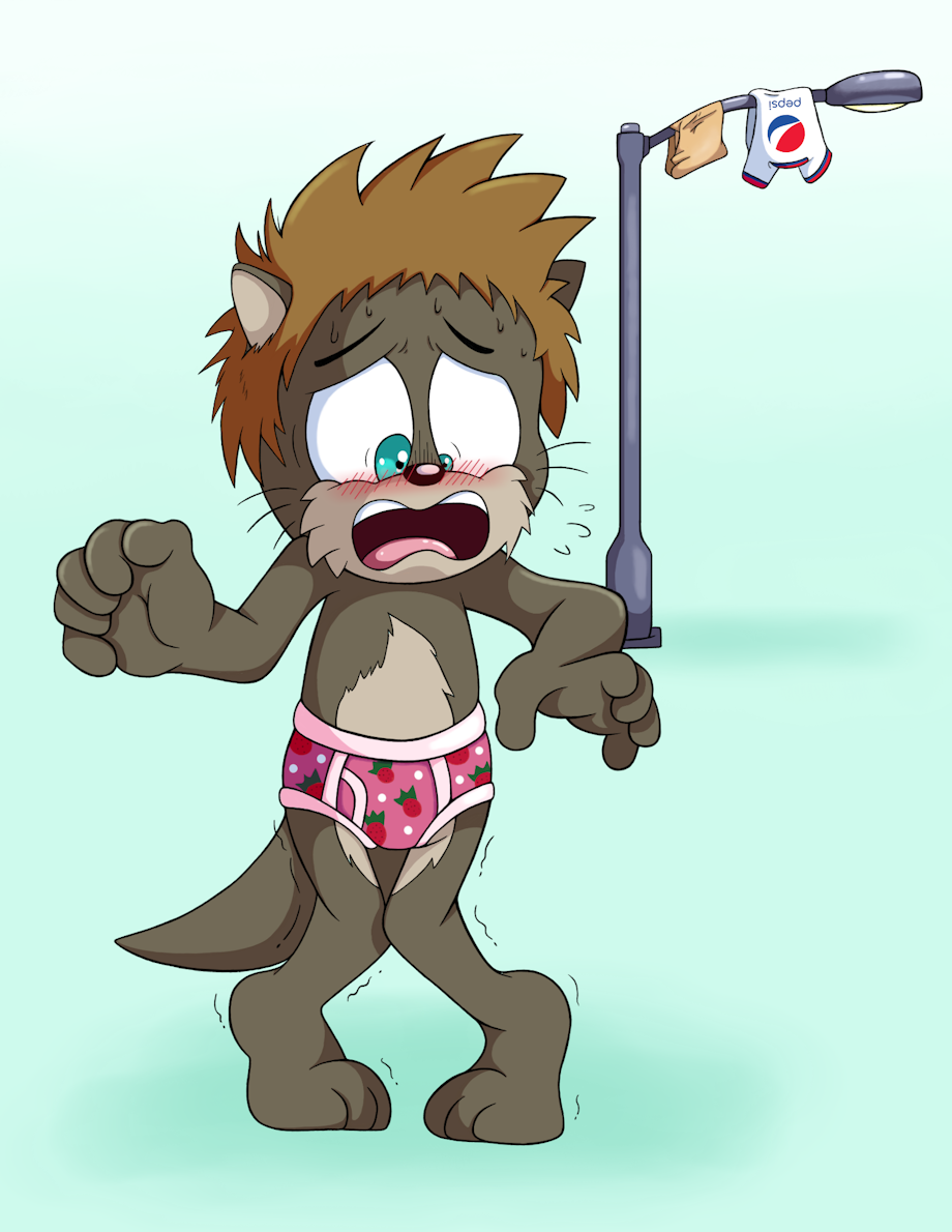 For many people, being stuck in public in nothing but a pair of briefs would be a collassoal nightmare. Even worse if your particular choice in undies is something exceedingly embarrassing. Unfortunately, Cj the Otter finds himself in this very situation. His Pepsi shirt and tan cargo shorts have been stripped from his body and flung over a street light. Exposed to everyone in public and blushing in response to the kick up of laughter around him, his only recourse would be to put on a cute and hilarious show of him trying to claim them back. Either that or run home and hope he can make his way back into his house without his keys.