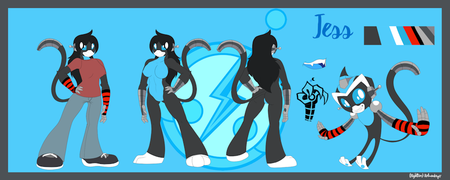 Black fur with some blue on the front. White snout. Blue eyes. Black hair. Metal lower arms and hands, tip of the tail.