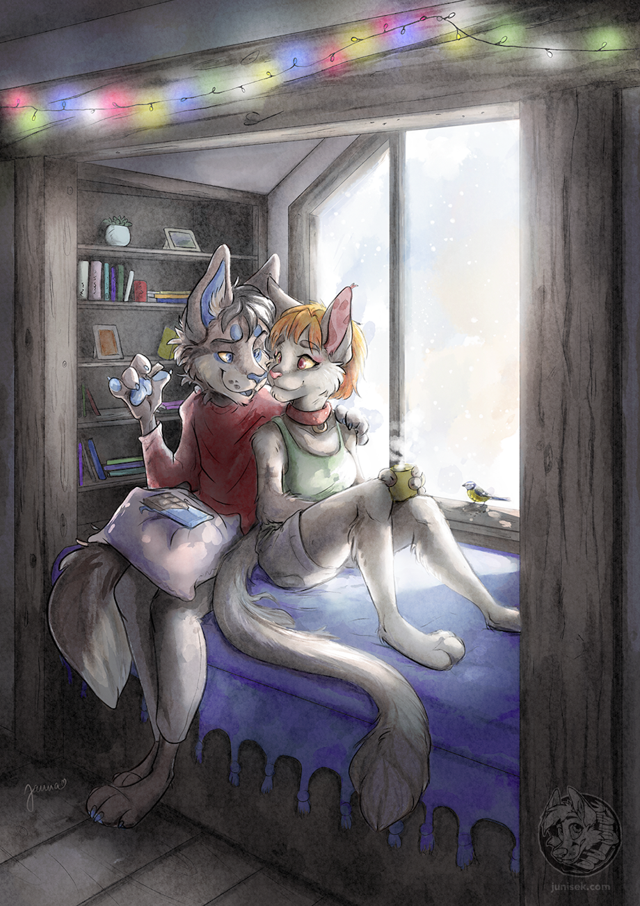 Art trade with mari! Chilling with Aokami, on a window seat, eating chocolate and drinking warm tea :3