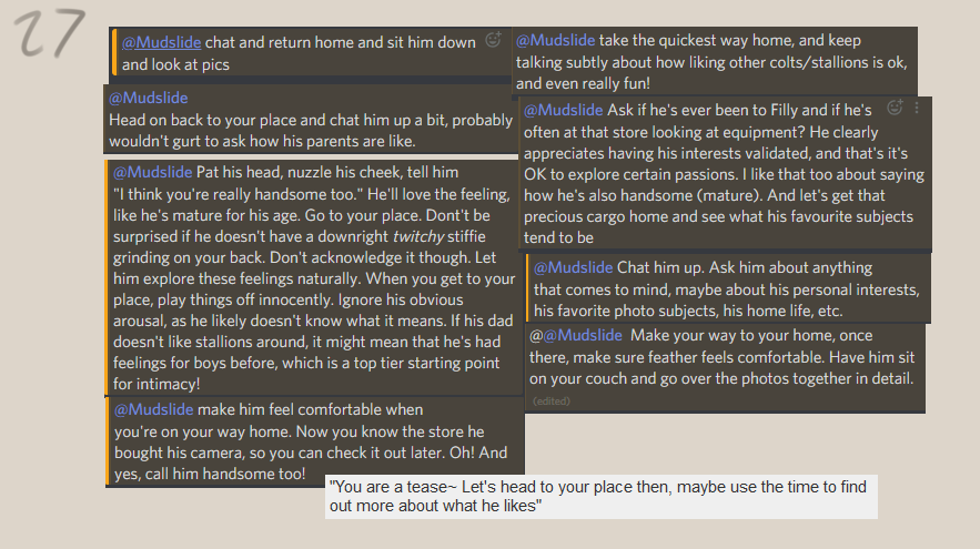 You head off to your place with Feather on your back and make a bit of small talk. You ask him about various things like his parents and Fillydelphia. He says that he loves his parents but they're sort of nosy, and that he really wants to see Fillydelphia someday. Feather talks about wanting to visit his big sister and tour the city with her because of all the cool things she tells him about it.