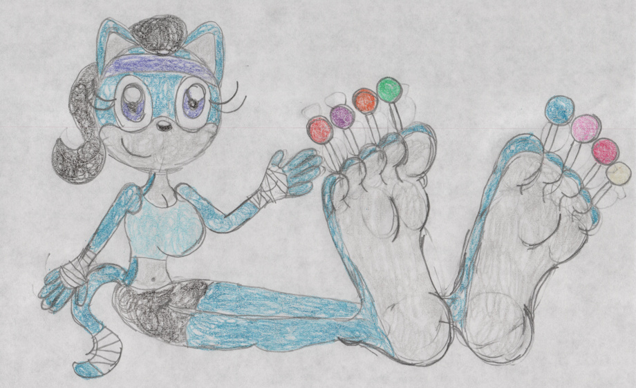 Here, we have Nancy the Panther holding sugar-free lollipops between her toes. The flavors are cherry, grape, orange, green apple, blue raspberry, watermelon, strawberry, and lemon.