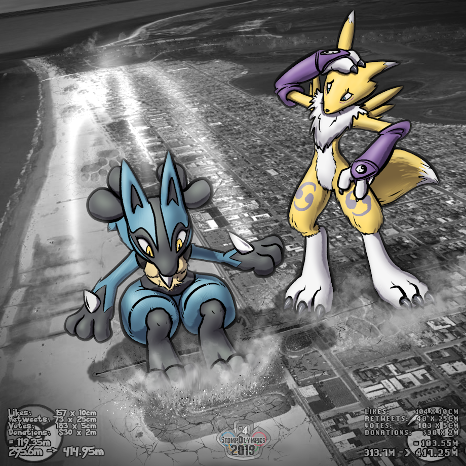 Lucario continues to outgrow Renamon, gaining another 16 meters and securing a win by crushing the Wildwoods Convention Center on her third jump! That's over 4.2 km from the edge of town!