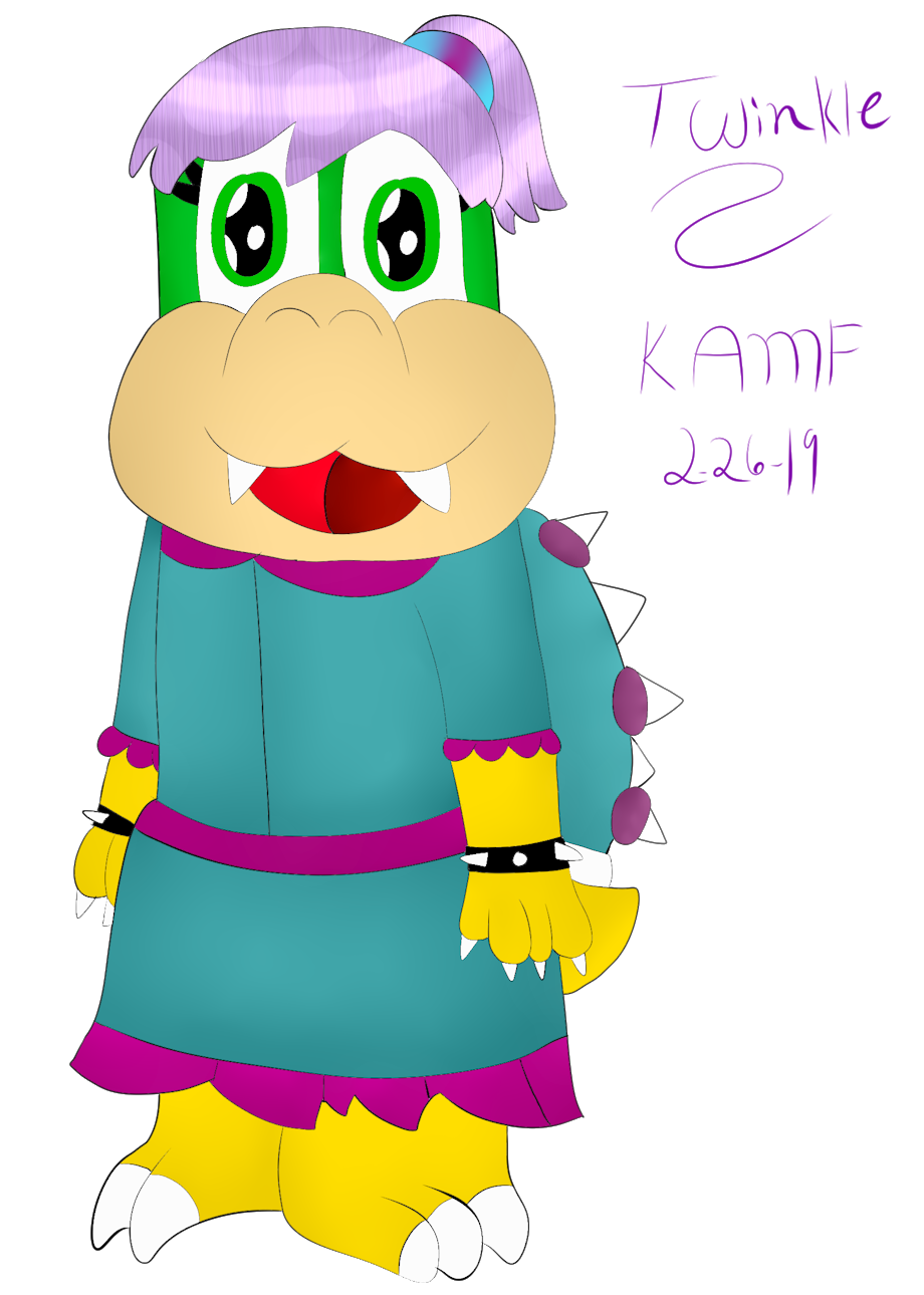 Fun Fact: Twinkle used to be in south park form like i said all the the time, since I lost intest in South Park long ago and got back into it I decided to make her as a koopa. Anyway Twinkle is a very friendly koopa, she love making anykind of friends. She is very polite, she always ask nicley for things. She is very fair, when plays fair games. When she loses she is also cool with it. She is very very honest, she never teals lies. even if she did something bad she is always honest. She is very patient, she dosent rush into things. She is also a gamer, she love love playing video games. She plays games all the time with her boyfriend Coal jr. She always beats him at it XD. She mostly plays Mario Kart 8 Deluxe.