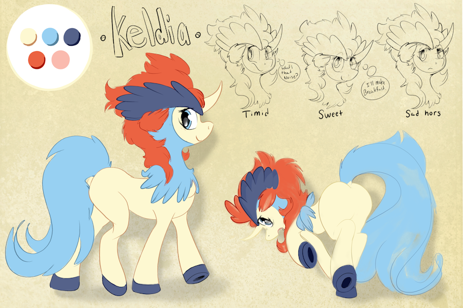 As a pony character, Keldia is the last of her kind, a rare water breed of kelpie that were raised primarily on land in island tribes. Not much is known about her childhood, because of her reclusiveness and unwillingness to open up about it, but most assume that due to a feud that took place between her species, that her species was wiped out. Keldia, being the last remaining character of her kind, was found at sea and brought back to the main continent of Equestria where she was nurtured back to health.