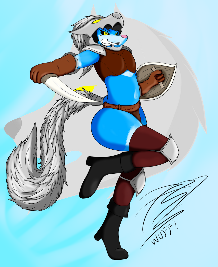 A fun, kind of ridiculous fantasy armor kind of thing with a wolf theme going on from the helmet all the way to the tail, with a little dinky dagger and shield which are pretty much useless, but I love it, just the kind of thing I would wear