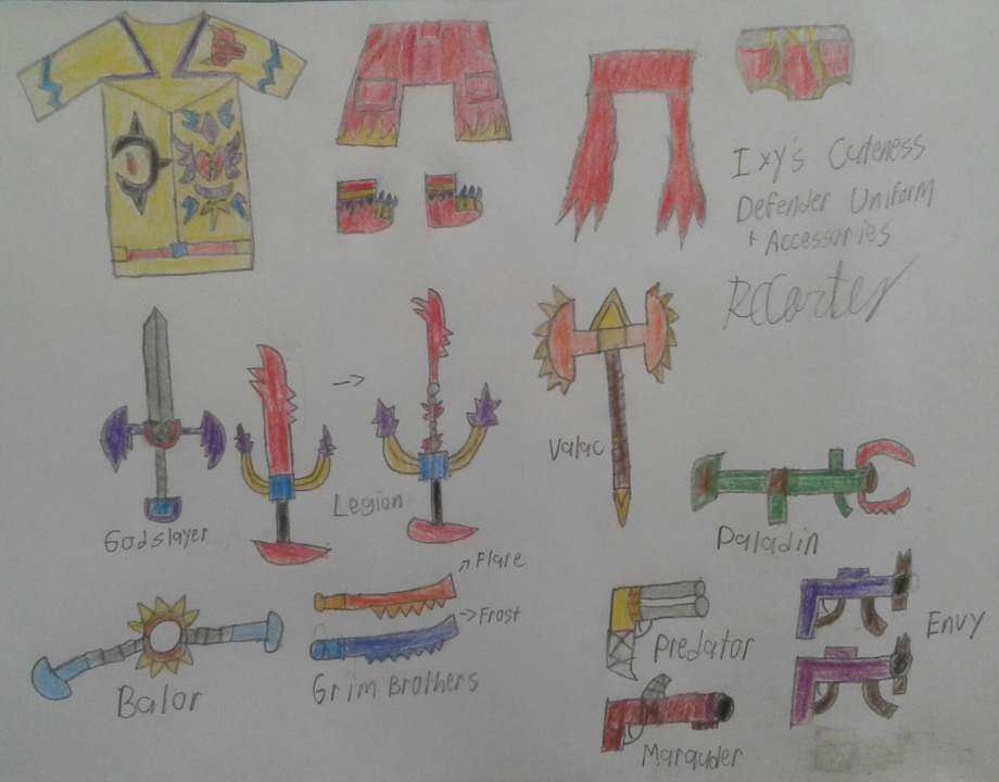 So Ixy as I see him is a pretty cool Fox kid with Demon powers. And what's the best way to kill the Demon Empire than with Demon magic infused weapons? his Uniform is Colorful (With yellow base color plus Purple side stripes, red belt line, and his own tatoo pasted on the left side of his uniform. Not only that but there is a Custom cuteness Defender uniform in the right side) And I managed to replicate his Shorts and ridiculous Scarf not to mention I added shoes for him to wear and replicated his underwear (Kid's got some new fashion sense for once)