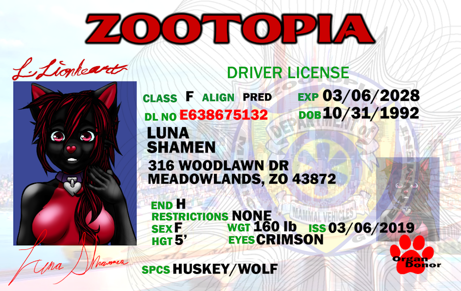 My Zootopia Drivers License made by Katsune Chordeva. He is selling Zootopia Drivers License's and other ids $15 if you have a head already that he can use or $35 if you want him to draw a new one.