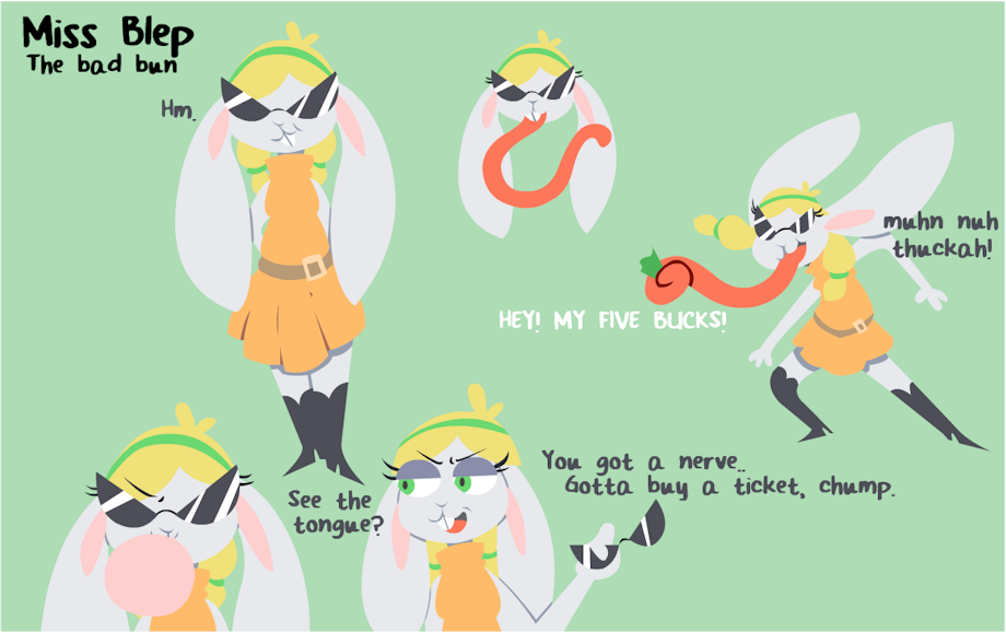 Miss Blep is one bad bun who is on the run. Hopping towns and putting on shows, this big sunglasses wearing lass has an unusual talent that can easily take the guarded by surprise.
