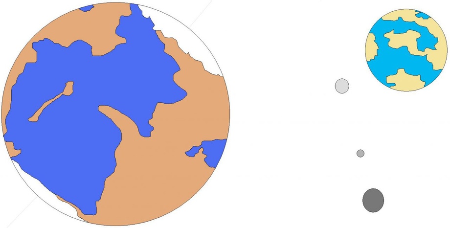 I did this for my story "Master's Pet". This is Ainoko's homeworld Velora, to help me visualize where he and his sister were born and where his father traveled in order to keep his son safe. The planet's population is highly advanced, yet at the same time are agrarian and early industrial. Society and civilization in general shuns any technology that makes life too easy and carefree. There are no weapons of mass destruction on Velora despite their capability to build and use such technology. Visitors, may find it unnerving as well as disturbing to discover that on Velora and it's moon that slavery is a major part of society, even more so that a significant portion of the population do so by choice.