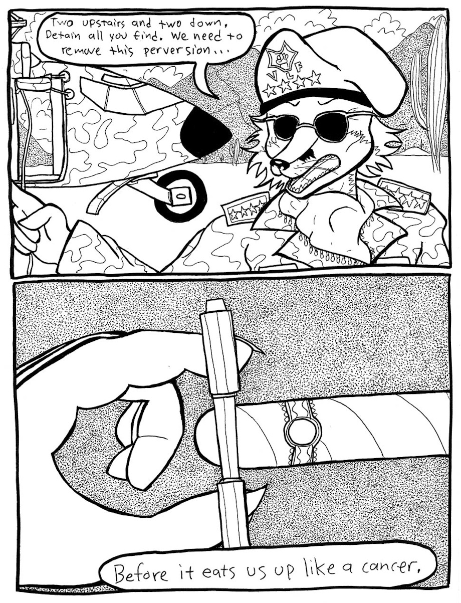 This is a comic I started back in 2010 that has become massive. It's about a group of revolutionary red foxes, the Vulpine Liberation Front (VLF), and their plot to trap a couple of problem cops into a forceful, sex-and-drugs based "social rehabilitation" program run by the group.