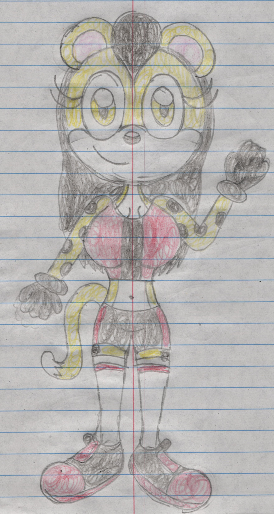 In keeping up with the hype of Mario and Sonic at the Tokyo 2020 Olympic Games, I've decided to draw Kathy the Cheetah wearing a custom-made sports outfit. It's a red tank top with a black stripe, black shorts with red stripes, black gloves, long white socks with red stripes, and black sneakers with red soles, toes, and straps.
