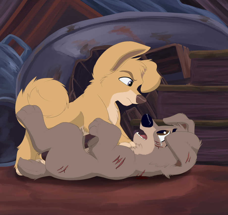 Okay, so in the movie, there's a scene where Scamp blurts out Angel's heartfelt secret about wanting to be a cherished family dog; despite having promised her a mere few hours prior that her secret was safe with him. The stakes being on the fact if Buster and the Junkyard Gang found out, she'd be booted out of her only support group and shelter left despite her distaste for that particular lifestyle. We briefly see Angel get into a crouched position with an enraged look on her face and Scamp backing away from her in fear, as if she was gonna pounce on and give him a thumping had Buster not intervened. However, being a gushy Disney movie, this was not to be! Dissatisfied as I was, I decided to commission this piece in order to display what really should've happened instead. Dogs don't argue like people, and my thinking is in a slight burst of fury due to having her trust betrayed yet again, Angel would unleash herself on Scamp momentarily to not only reprimmend his actions, but to teach him a true street dog's lesson as well. Rather than a rolled up newspaper swat on the butt he was used to back home, this was a lesson brought on by the School of Hard Knocks! As Angel had teased him about upon their first meeting. I also think this would have played a more potent role is Scamp's decision to return home to his family. Having been pampered all his life, there's no way he'd know how to stand up and defend himself against other strays, especially those larger and stronger than he is. Although Buster was his idol, Buster detested him for the simple fact he is Tramp's son and so if he had stayed with the Junkyard Dogs, he'd have very likely been at the bottom of the heap so to say at all times when it came to eating and special privileges all the other dogs enjoyed.
