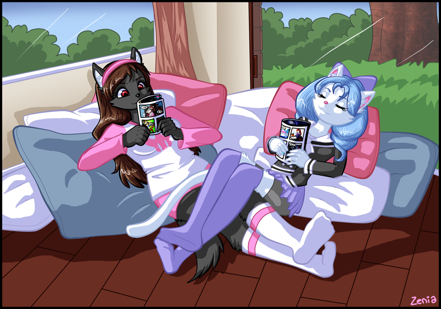 For some reason this looks like a swell little guest house or a room extension just to make room for a nice pillow pit. On the two lasses, their clothing looks really cozy and I love their hair coloring!