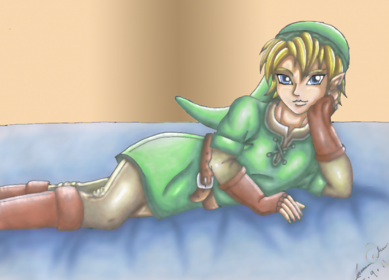 This is another old picture of Link from Twilight Princess I did back in May of 2011 and took me 2 days. Used watercolor pencils for him and the bed. Used Photoshop for the gradient wall behind him, and the small highlights on his hair, face, and body... ^////////^