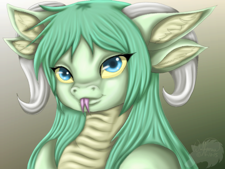 She's a cute little girl dragon with four ears and ram horns. She sticking out her tongue.