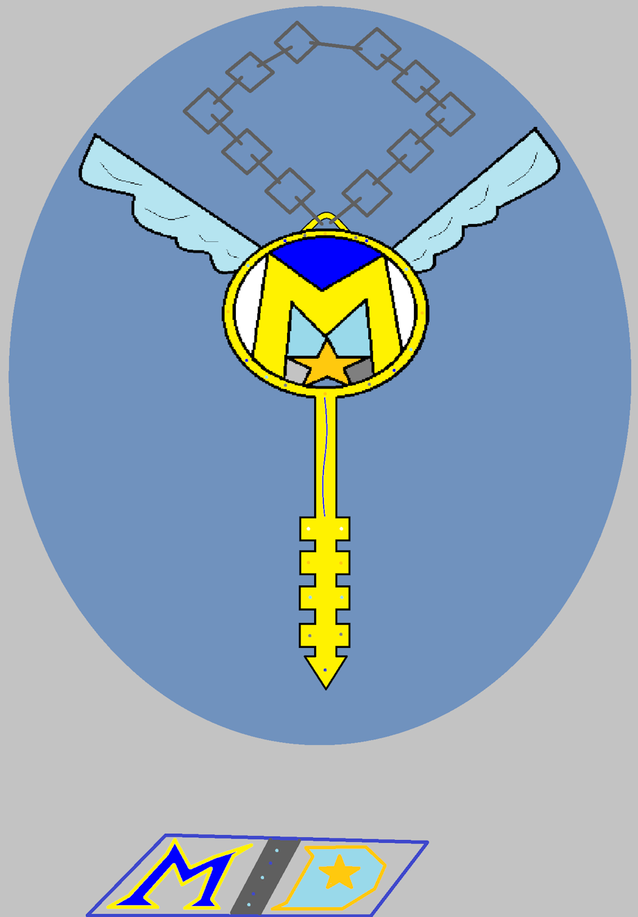 This is my emblem, the Multi-Key, only upgraded to The Multi-Pendant.With better wings, a chain link to hold it, the letter M with a star at the bottom of it, small colored dots on the circle, eight rectangular stubs at the bottom of the long arrow, and added a few colors. Hope like my upgrade, dudes and dudettes.