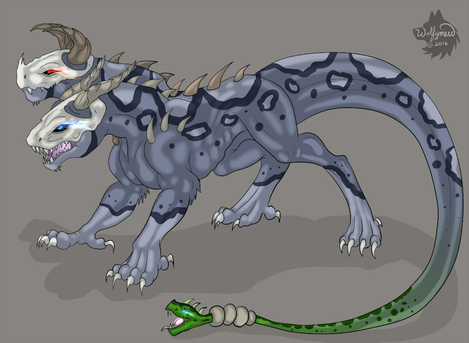 This is a dragony demon thing with two heads. Red-eyed head's mouth leads to the stomach. Blue-eyed head's mouth leads to a expandable safety pouch where it's warm and snuggly. (like a kangaroo) The snake tail's mouth also leads to the safety pouch, but it can only swallow small things.