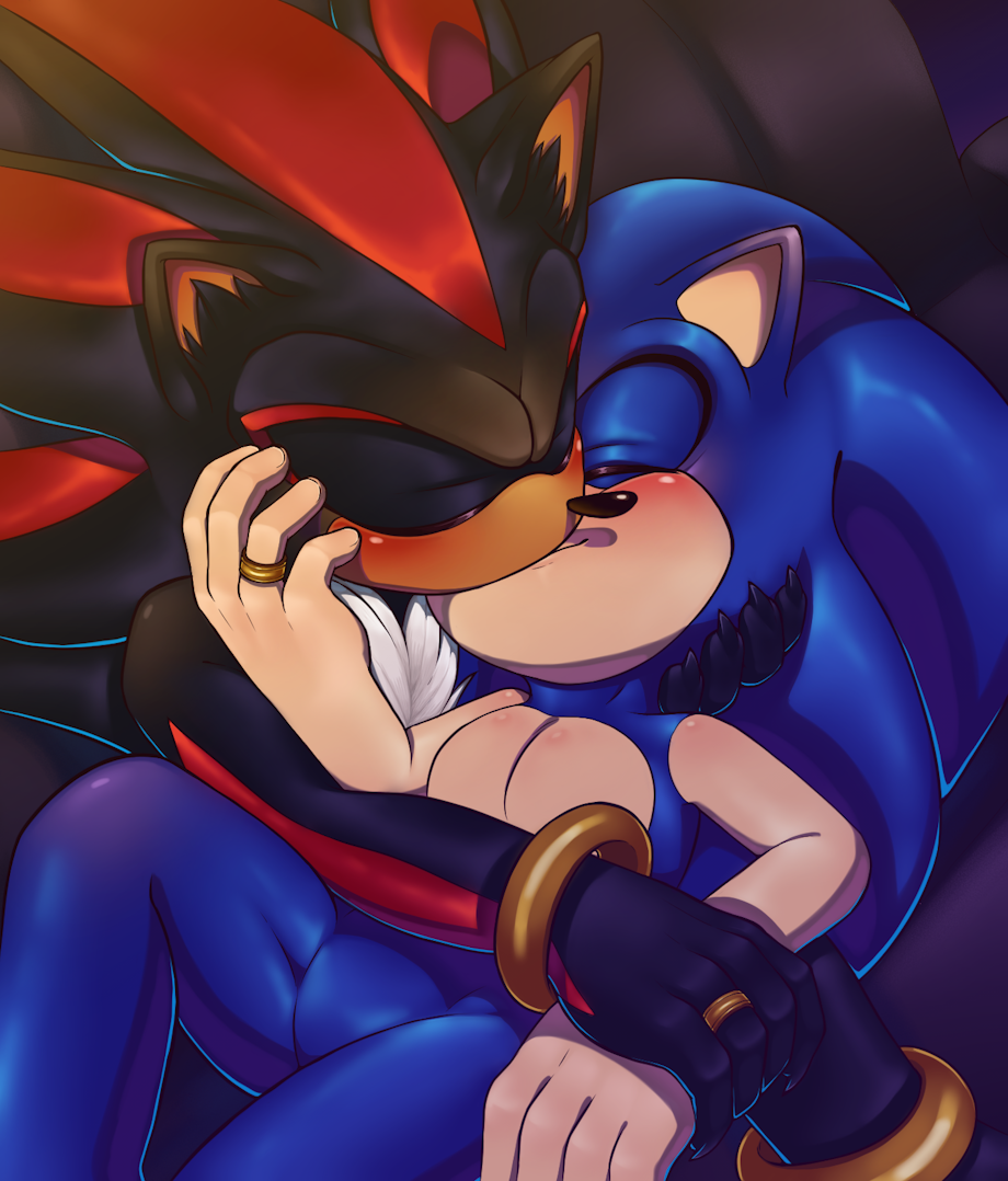 I love everything about this picture. Shadow and Sonic having some quality time together: Seeing kissing with a smile and also wearing wedding rings on their fingers. I LOVE SONADOW!!