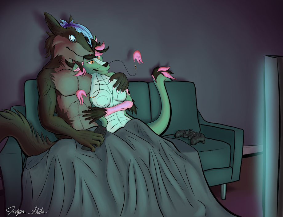 Commission for Discord users CountBagel and Cora, for their anniversary! This piece features their sonas Zane the Sergal and Cora the Kirin, cuddled up on the couch enjoying some quality time together...also Netflix in the background, but that matters a bit less. It was an absolute pleasure to do this fine illustration for such a lovely couple - especially when it comes to a wholesome subject matter as this.