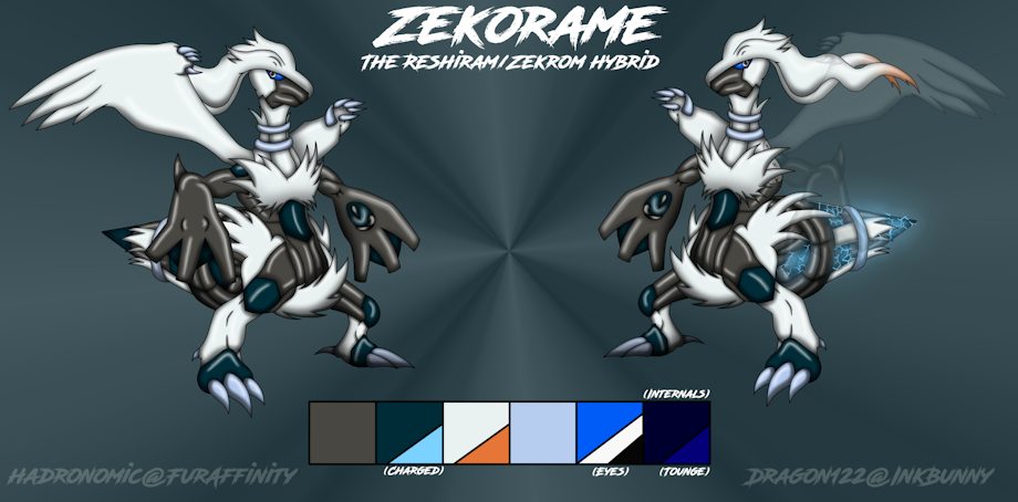 His name is Zekorame, he's a Reshiram & Zekrom hybrid, combining my two favorite Pokemon into one.